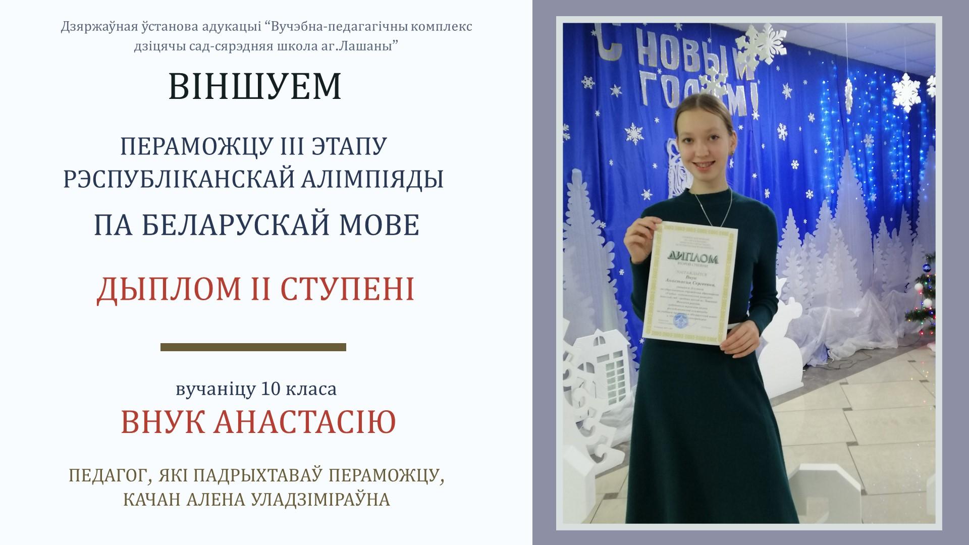 - Дыплом 3 ступені ў заключным этапе рэспубліканскай алімпіяды па Беларускай мове – Внук Анастасія.