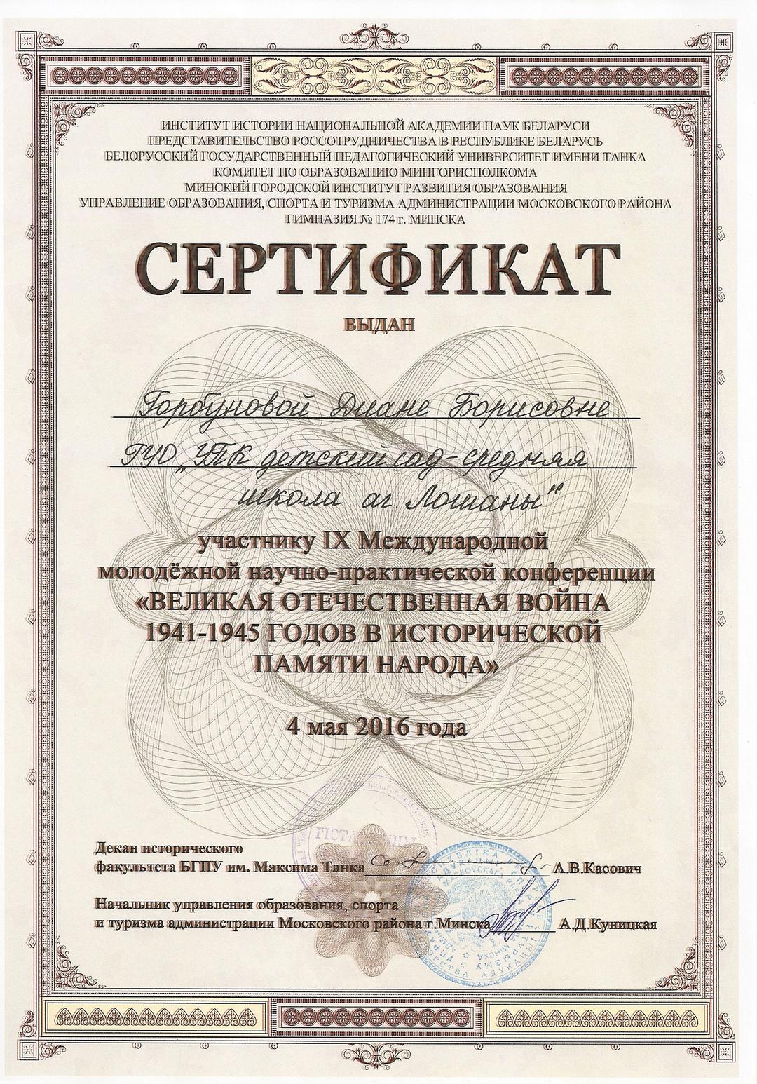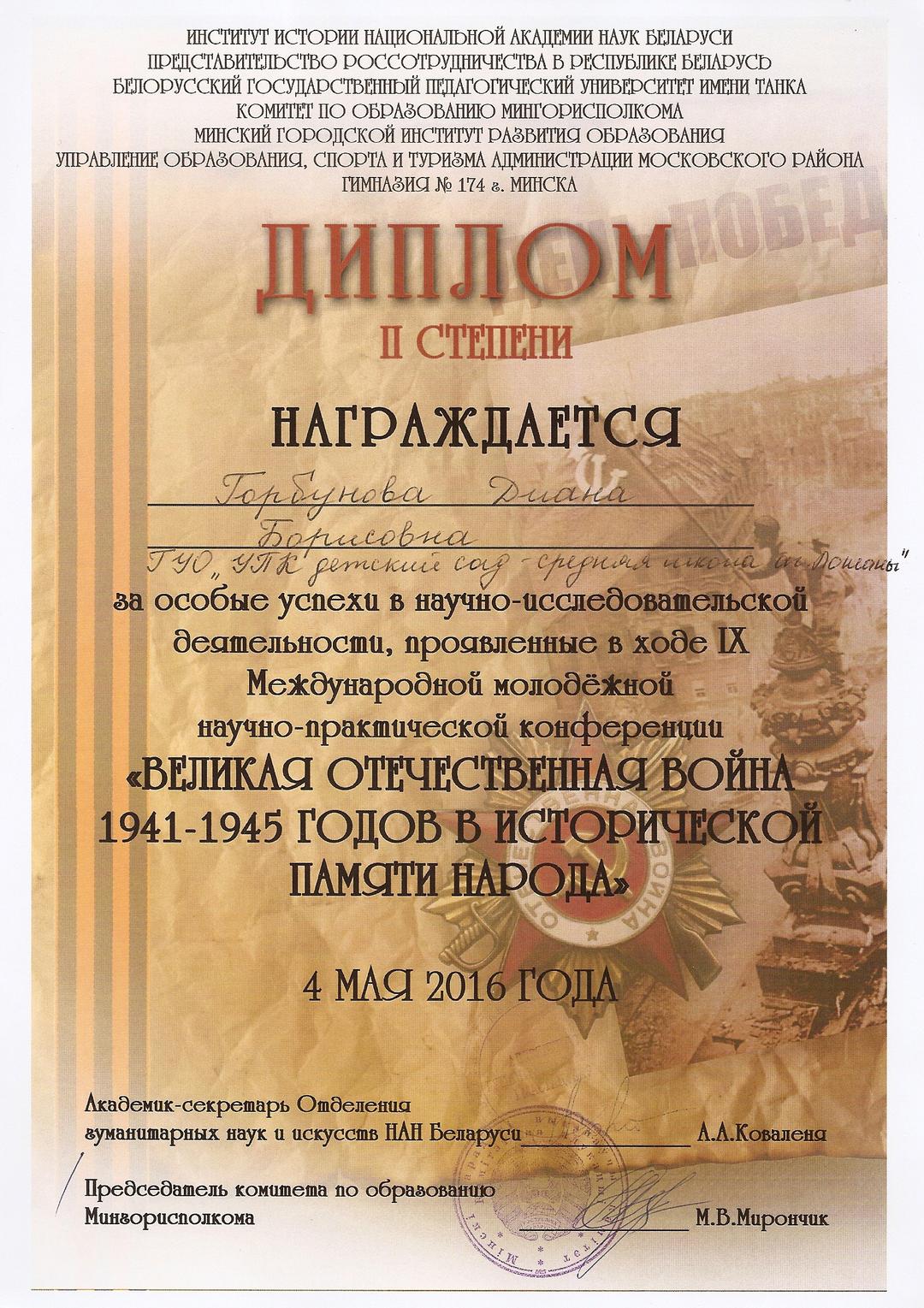 - Дыплом III ступені VI адкрытай рэспубліканскай вочна-завочнай навукова-практычнай канферэнцыі «На карысць Радзімы і чалавека» з міжнародным удзелам (у рэжыме анлайн) секцыя 6. НЕ ЦЬМЯНЕЕ ЛЕТАПІС ПЕРАМОГ. Вучаніца 8 класа Рэзнік Вікторыя. (ад 21.02.22) Кіраўнік Прахарчык С. В.