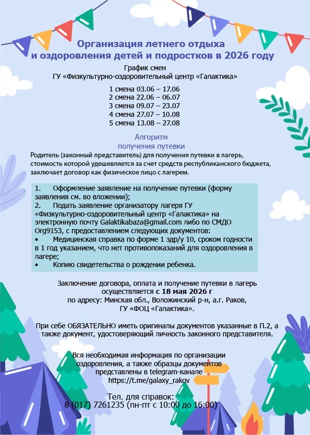 Заключение договора, оплата и получение путевки в лагерь осуществляется с 18 мая 2026 г по адресу: Минская обл., Воложинский р-н, а.г. Раков, ГУ «ФОЦ «Галактика».