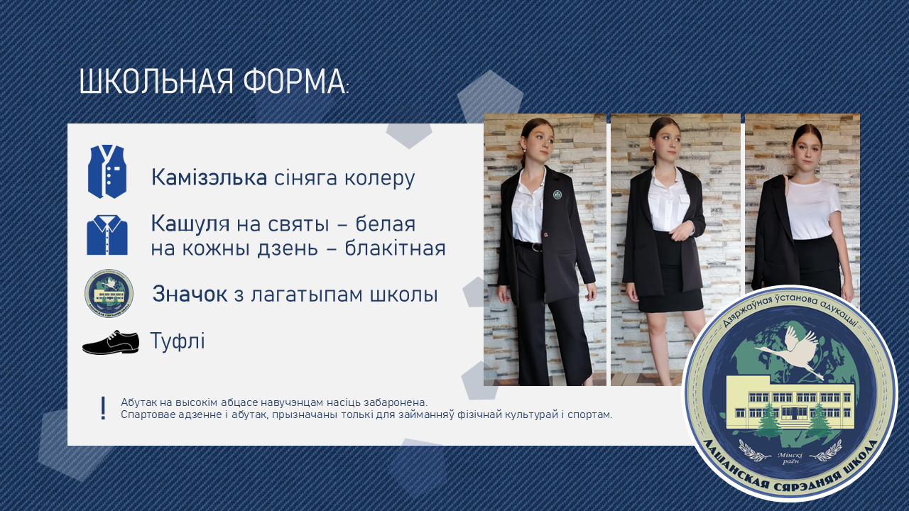 23. Дзелавы стыль адзення – гэта строгі вытрыманы стыль адзення, які можа ўключаць агульныя (аднолькавыя) элементы школьнага адзення з размяшчэннем на адным з элементаў эмблемы ўстановы агульнай сярэдняй адукацыі (пінжаку, камізэльцы, сарафане, сукенцы).